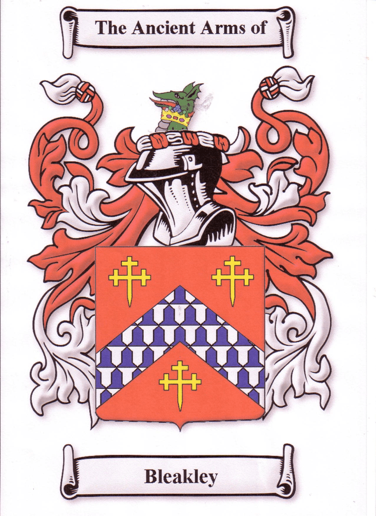 The Bleakley family emerged as notable Englishmen in Lancaster in the parish of Manchester where even now the name remains with considerable popularity. Early registrations of the name, shows branches of the family to be located in Lancashire between Bury and Manchester, and the family is recorded as one of great antiquity. But by 1321 A.D., a branch had moved northward to Dumfriesshire in lowland Scotland.