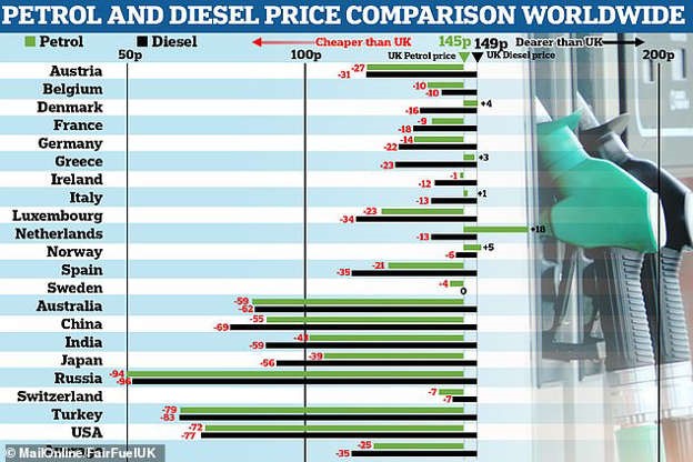 Motorists in Russia pay around 94p a litre less for their petrol than drivers in Britain, according to figures from FairFuelUK.
