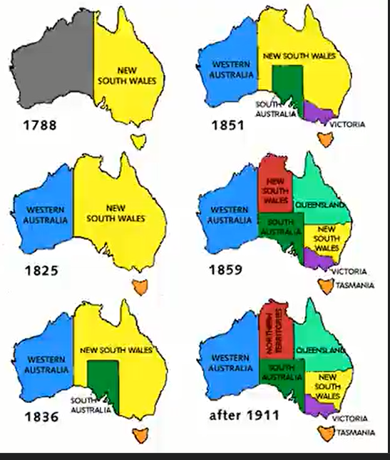There are enough publish details of the First Fleet and Settlement so I do not need to recount them here. The continent was only claimed to the 135th meridian as New South Wales on 9 February 1788 and the other Colonies (excluding various boundary changes) were proclaimed as follows:- Van Dieman’s Land 3 December 1825, Swan River 29 May 1829 proclaimed Western Australia 6 February 1832, Province of South Australia 19 February 1836, (Islands of New Zealand annexed to NSW 15June 1839, split 16 November 1840), North Australia 17 February 1846 merged back 28 December 1847, Victoria 1 July 1851, VDL became Tasmania 1 January 1856. Queensland 6 June 1859, SA 10 October 1861, NT to SA 6 July 1863, TS to Qld 21 July 1879, Australia 1 January 1901.