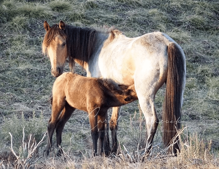With the news of finding the Pali mare, Apollo etc I want to discuss colour genetics.This first time Mumma is actual out of the Pali mare and assumedly by the Roan stallion. First glance she is Buckskin, she was born Buckskin but now her head is Bucky and the rest of her body is showing roan tendencies. This gorgeous foal once again we will assume is by a Grey, other photos are showing he may not grey out and looks to be a burnt buckskin. Can those in the now assist in what (a) you think her colour is? And (b) if foals daddy is indeed the grey even though he looks Bucky are the chances he will grey? Love to hear your thoughts. Photo Copyright to Carol Hancock