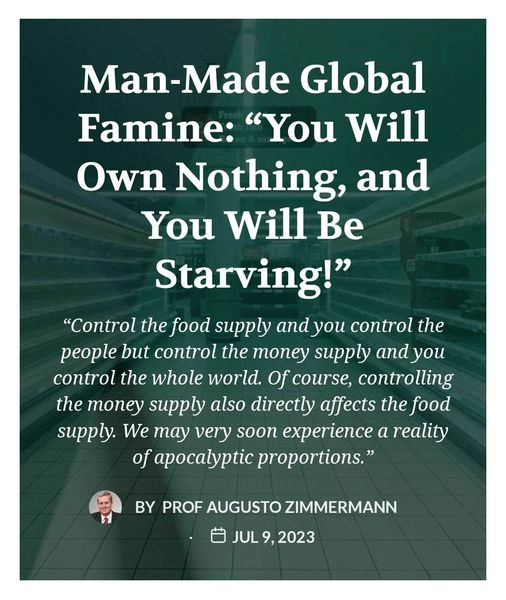 The global oligarchs are now admonishing us of a possible global famine that may be caused by extraordinary human conflicts and natural disasters. For example, the Dutch government has recently released a statement that attempts to deflect the attention of the general public from their own extreme anti-farming policies by claiming that “because of climate change, poor harvests, armed conflicts and population growth, the danger of famine is increasing”.[1]