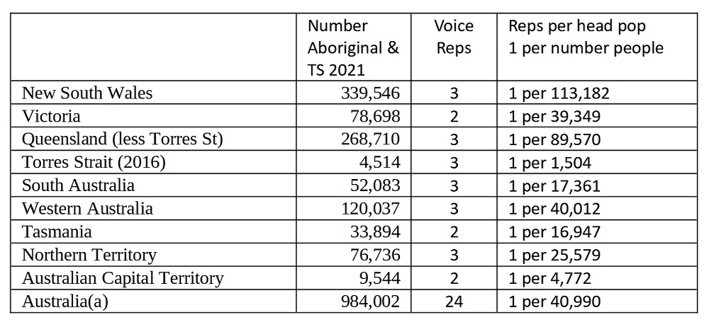 The first observation to make is the major numerical (and hence power) imbalance between the states/territories. New South Wales is the most disadvantaged, followed by Queensland and Western Australia. The Torres Strait Islanders, Canberra (ACT), Tasmania, South Australia, and Northern Territory will have dominant sway with 13 of the 24 representatives. That is, these smaller states/territories with just 18 per cent of the Indigenous population will have more than 50 per cent of the representatives on the Voice.