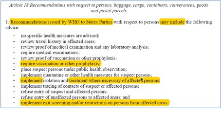 But the substance of the amendments to the IHR is plain and simple: Australia will be obliged to follow the WHO’s ‘recommendations’ in relation to public health, in the event of a public health emergency such as a pandemic. We can see this in the proposed amendments to Articles 1, 13A, 42 and 43 of the IHR. Yes, it will be Australia making the decisions, but we will have given the WHO the authority to tell us what those decisions should be. You can argue until the cows come home whether that’s ‘ceding sovereignty’ but I ask you, why would an Australian government want to put us in the position where we may be obliged to follow the WHO’s ‘recommendations’ in the first place? Australians should note that the list of (binding) recommendations in Article 18 includes mandatory vaccination, isolation requirements, medical treatment, and other restrictions: