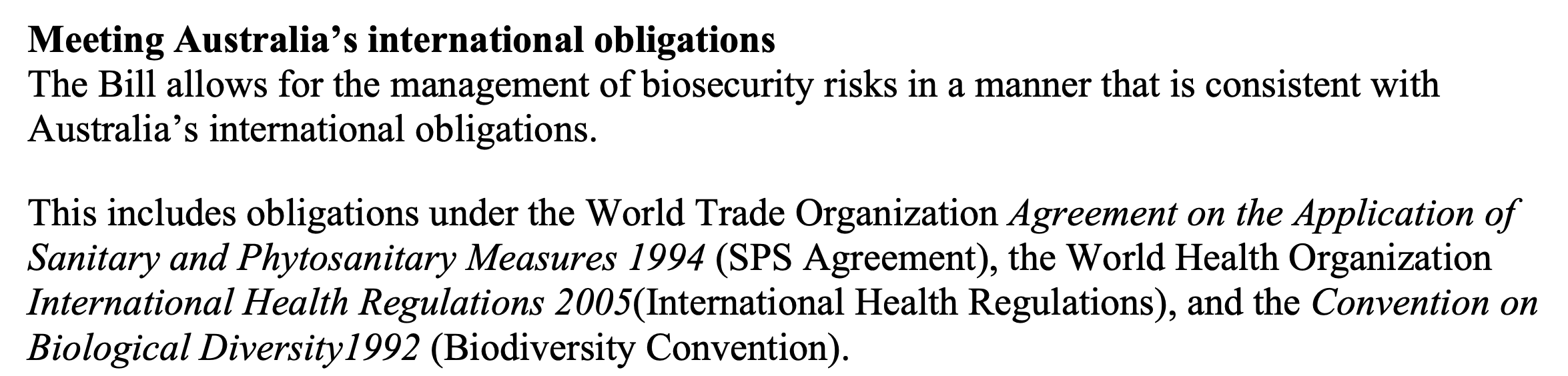 The government’s Explanatory Memorandum for the Bill which became the Biosecurity Act 2015 states the intention was to enable Australia to comply with our international legal obligations including the International Health Regulations: