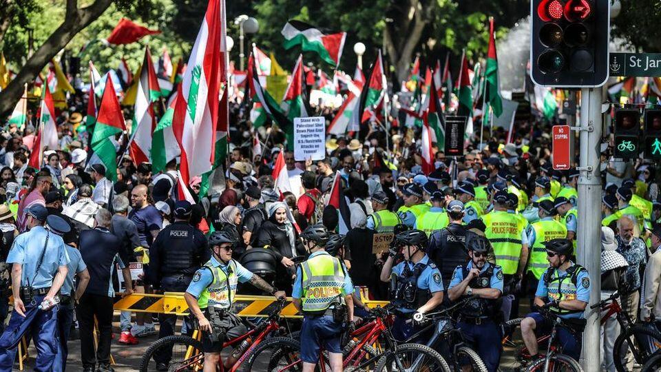 1/ Pro-Palestinian supporters gather during a protest at Hyde Park on October 6, Sydney, NSW.